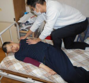 側臥位をとらせ、腰を床面に直角になるように補助し、腰を支点に肩を援助しながら躯幹部をひねるように弛めていく課題です。